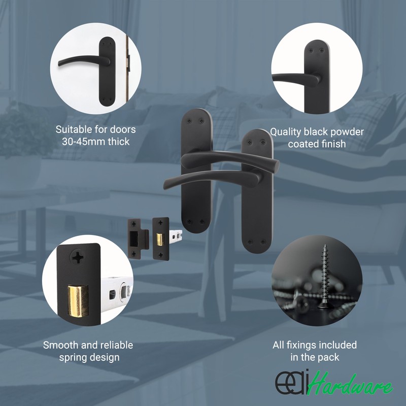EAI Black Door Handle & Latch Set - 1 Pair Matt Black Internal Lever Handles on Backplate with Latch (64mm) - Novoli Range
