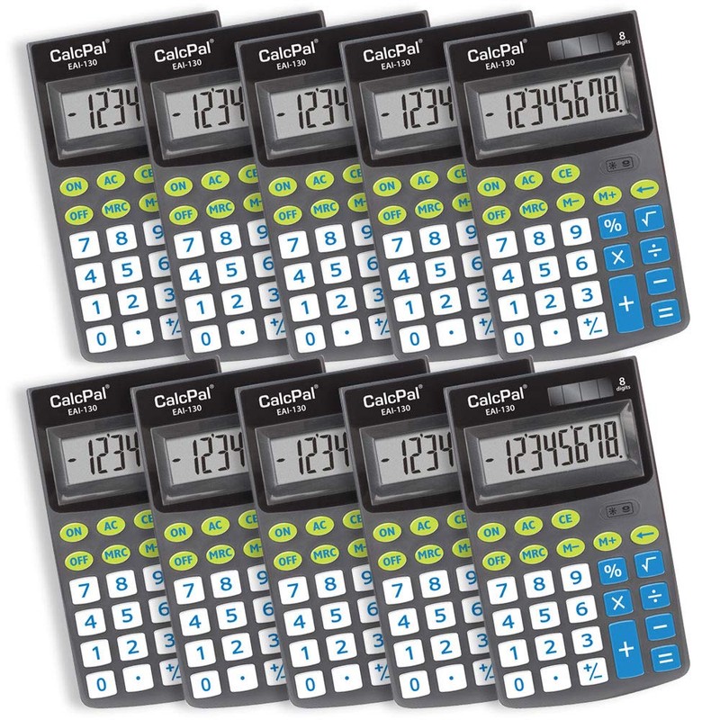 - A 10-pack of our easy-to-use, durable calculator with hard plastic keys, features an 8-digit display, 4 functions, +/ sign, square root, percent, memory and backspace key.