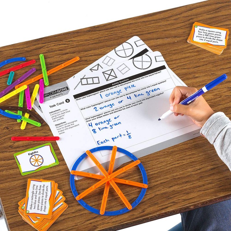 - The Investigating Fractions Teacher Set includes:1 Exploragons Circles and Polygons Student Set of 66 pieces, 20 Quick Check cards, and 10 dry-erase Task Cards, which provide activities that cover halves, thirds, fourths, sixths, and eighths.