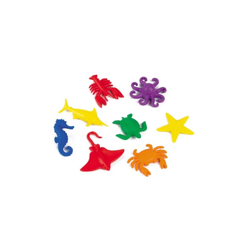 This set includes 8 sea creatures: crab swordfish octopus lobster sea turtle seahorse starfish and stingray. 3 pieces for each color (6 colors). Made of soft rubber. Packed in a jar.0
