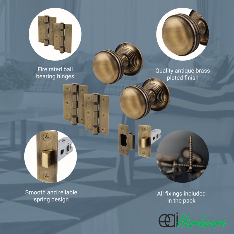 EAI Lined Door Knob Set Antique Brass | 1 Pair of Mortice Knobs (55mm) & Latch (76mm) for Internal Doors