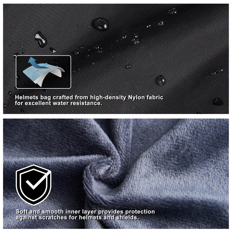 - Made from high-density Nylon fabric, this helmet bag offers exceptional water resistance. Its soft and smooth inner layer shields helmets and shields from scratches