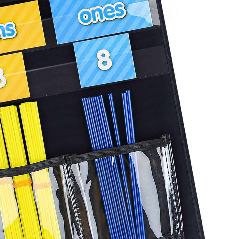 - EASY TO USE:Simply hang the durable nylon chart on a bulletin board or chart stand…cut the cards apart and place the title card in the top row…then slide the place value and number cards in the next two rows and insert corresponding numbers of counting straws in the large clear-view pockets at the bottom.