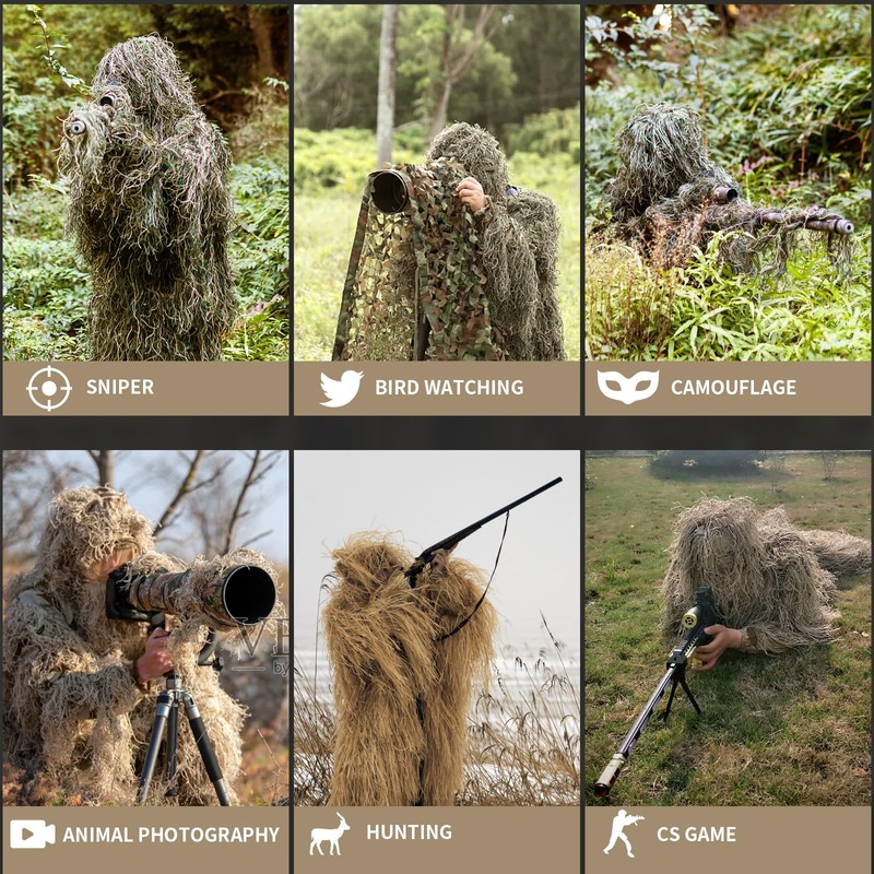 - 【Wide Applications】- For Outdoor Hunting,Funny Parties,Halloween Costume, Stalking, Wildlife Photography,Birdwatching,Film Sets,Nightclubs,Kids Play Dens,Tree Houses,etc. The suit blends perfectly into trees, grass and surrounding shrubbery. You can literally disappear into the bushes and the surrounding habitat. This ghillie suit will be a helper for your hunting or a hit costume during festival.