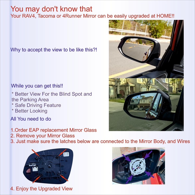 - Direct and easy installation; just attached the metal clip to the back plate (If Applicable) and then attached the mirror glass to you mirror body, apply force on all sides equally and increase it gradually until you hear the click sound, 10-20 min DIY job! Installation Manual Included