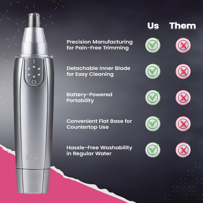 - Sleek & Elegant: With a classy color and ergonomic design, this nose ear trimmer for men and women combines functionality and style. Place the flat base of the trimmer on your dressing or bathroom counter for easy access.
