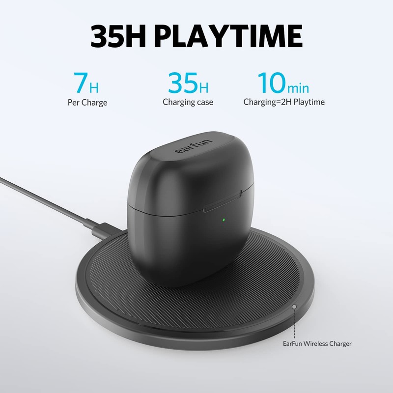 - 🎶UP TO 35 HOURS WHOLE DAY PLAYTIME🎶: The wireless earbuds deliver an impressively long battery life of 35 hours. And listen for up to 6 hours on a single charge. If the Bluetooth headphones are running low, a quick 10-minute USB charge or wireless charge gives you up to 2 hours of playtime, give you all day long playing! NOTE: please dry the earbuds before you put them back into the charging case. Sweat or water on the earbuds might cause short circuit and damage the product during charging.