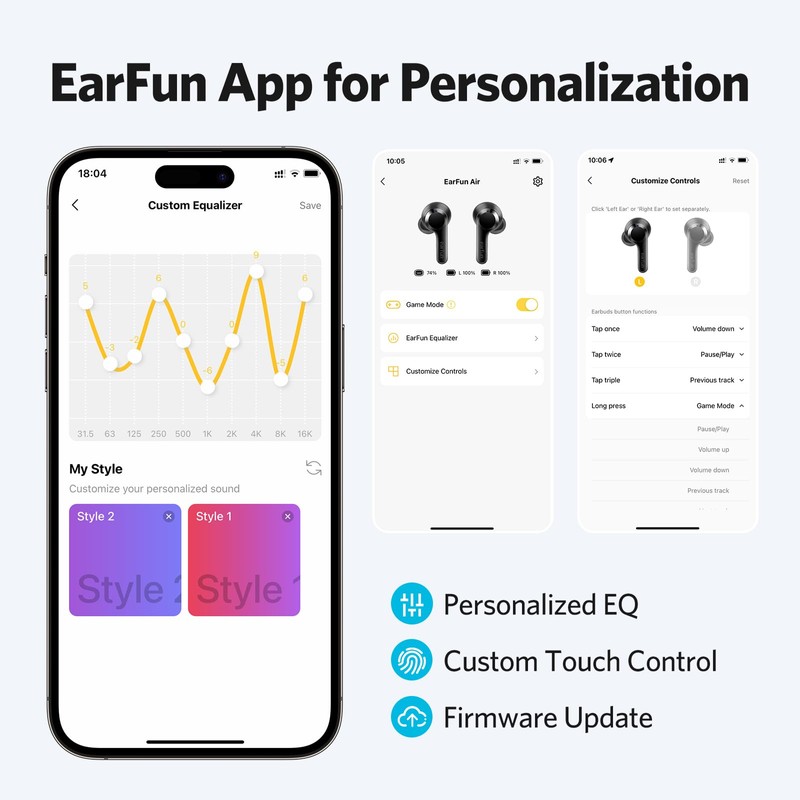 - đź’–CUSTOM EARFUN AUDIO APPđź’– Use the EarFun App to customize your exclusive preference. Now you can adjust the sound equalizer (10-band EQ), customizing the sounds for your taste. Besides, the APP will show the battery lever of your each earbud, adjust and disable the touch control, upgrade firmware, and more. Download EarFun Audio APP to Get More Functions!