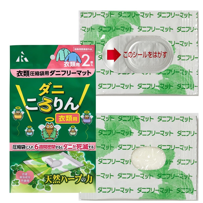 - Dust Mite Free Mat for Clothing Compression Bags This product is a non-medicinal product for repelling purposes. Simply toss them with your clothing and bedding to eliminate dust mites in your compression bag. Dust mites kill when sealed in a compression bag for 6 weeks. No synthetic insecticide ingredients. The power of natural herbs
