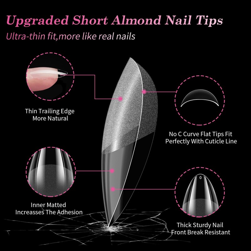 - Quality tips: EARLMONI short almond nail tips are made of high-quality materials, breathable and durable. Our nails are non-toxic, odourless and will not damage your natural nails, pre-shaped and easy to use, giving you a safe and comfortable nail experience