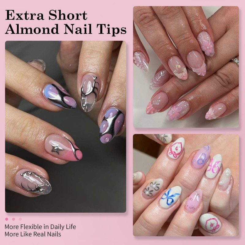 - DIY short almond nail tips: EARLMONI short almond nail tips fit perfectly with your natural nails. Soft gel tips can be used with nail glue, crystal powder, polka dot powder, etc. These gel tips can help you easily create many popular classic nail styles in your daily life