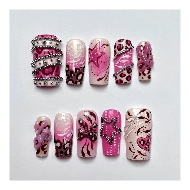 Early 2000s Chic Press On Nails Y2K Leopard Print Nail Set with 3D Bows and Star Accents Pink Glam False Nails for Party or Everyday Wear Glossy Black & White Design with Silver Chrome Beads:_Coffin_S
