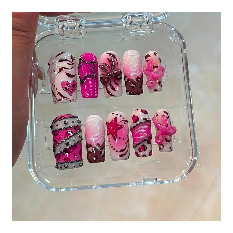 Early 2000s Chic Press On Nails Y2K Leopard Print Nail Set with 3D Bows and Star Accents Pink Glam False Nails for Party or Everyday Wear Glossy Black & White Design with Silver Chrome Beads:_Square_S