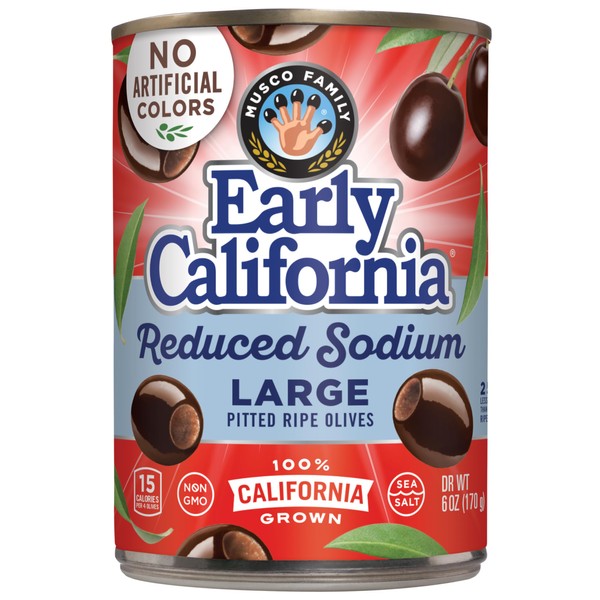 Early California Reduced-Sodium Ripe Pitted Large Black Olives are another delicious way to enjoy the savory flavor you have come to expect while keeping a heart healthy limit on the sodium in your daily diet! In fact, Early California Reduced-Sodium Ripe Pitted Large Black Olives contain 25-percent less sodium than their conventional counterparts. Not only that, but Early California Reduced-Sodium Ripe Pitted Large Black Olives are also a great source of monounsaturated fat, which has been repeatedly demonstrated in studies to lower bad (LDL) cholesterol. Even better, at a mere 25-calories per serving, they are a diet-friendly, satisfying, and flavorful choice. Early California Reduced-Sodium Ripe Pitted Large Black Olives come a package of twelve (12) 6-ounce cans and are a smart choice as a snack, a salad topper, a delicious recipe ingredient, or on a crowd-pleasing party platter. Nicolo Musco brought his olive expertise from Italy to California with the ambition of making a good thing even better. Since its founding, the Musco Family Olive Co. has been a reliable and trusted partner with customers, delivering the richest-flavored, highest-quality olives for three generations. Today, the company leverages its passion and expertise to pioneer ongoing innovations in production and environmental sustainability, while maintaining reliable and trusted partnerships with customers and delivering the richest-flavored, highest-quality olives.