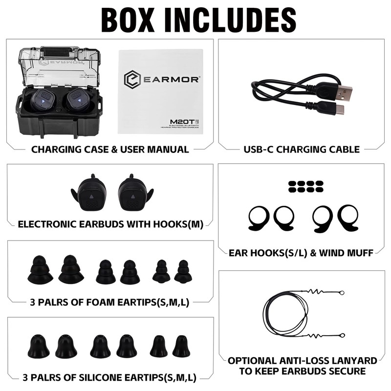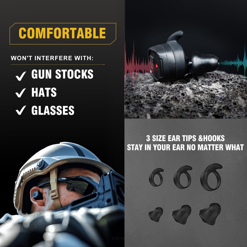 - Comfortable and Secure Fit: To ensure the best noise reduction and sound quality, each set comes with three different sizes of ear tips and ear hooks for a perfect fit. The ergonomic design ensures comfort without obstructing gun handling, wearing hats, or other movements. Comes with a detachable lanyard to prevent accidental loss