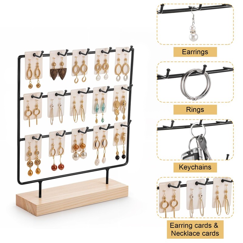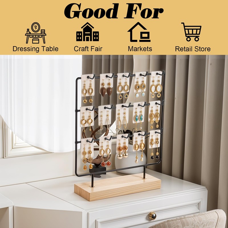 • Stable and Reliable: Earring display rack is made of premium quality iron, ensuring its durability and longevity. Its surface is coated with black coating, which both adds an elegant touch to the rack and prevents rusting, making it suitable for long-term use. Wooden base is not easily tipped over, keeping your merchandise safe at the counter or on the shelves.