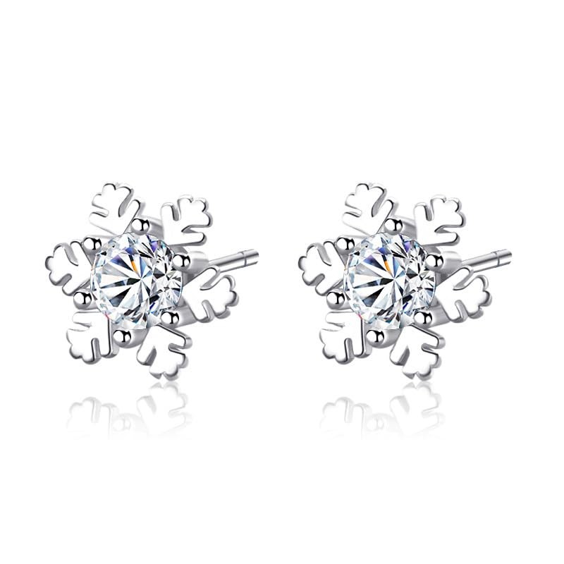 - ELEGANT SNOWFLAKE EARRINGS These dainty stud earrings are designed in the shape of detailed snowflakes and set with sparkling cubic zirconia stones.