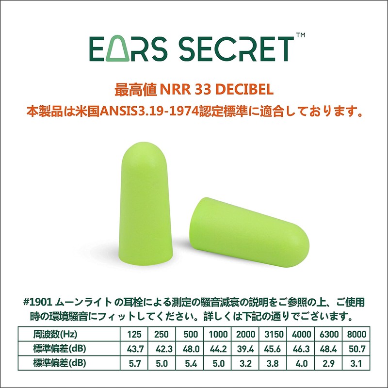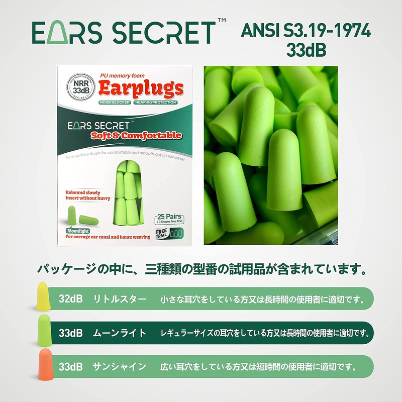 • (Includes 3 Pairs of Trials) EARS SECRET Moonlight is a regular size earplug, recommended for sleeping. To fit a variety of sizes of ear canals, EARS SECRET has trial of 3 shapes from large to small and has a trial pack of 25 pairs + 3 shapes