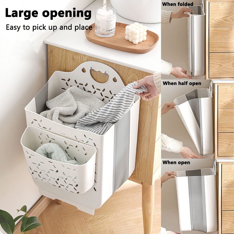 - 2 Packs Collapsible Laundry Basket : An amazing space saving hanging laundry hamper, It can either stand on its own or hang using the included adhesive hooks. Large storage in expanding but room saving in folding! If you like to sort the laundry, the small basket in the front are great, you can use them for your lingeries and socks.