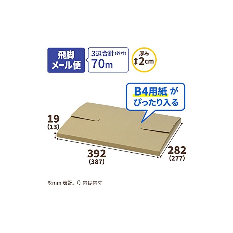 - (Bottom Surface: B4, Outer Thickness: 0.7 inches (1.9 cm)) Thin cardboard that is perfect for packing and shipping drawings and calendars, etc. The bottom is B4 size and the outside thickness is 1.9cm. Can be shipped by mail service or delivery size 80 etc