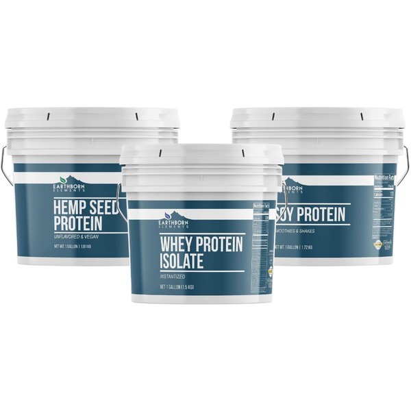Earthborn Elements Earthborn Elements Soy Protein, Hemp Seed Protein, and Whey Protein Isolate Bundle, 1 Gallon Bucket Each, Protein Powders, Workout Supplements