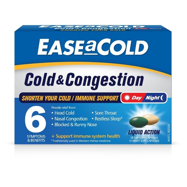 EASEaCOLD Cold & Congestion is specially formulated to relieve symptoms of common colds including sore throats, nasal congestion, runny nose and support the immune system to fight illness. The night formulation continues to relieve cold symptoms and contains a traditionally used Western herbal medicine Valerian to enhance sleep quality and reduce disturbed sleep.