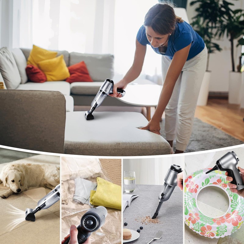 - 【3-In-1 Hand Held Vacuum】 The Car vacuum with Ingenious conical sealing technology makes it easily convert to a strong blower or inflator. Vacuum cleaner for car and food storage, a blower for any pet hair in sofa gap and dust in the computer, and a pump for balloon decoration. With 2 suction speeds, specialized attachments, and a seamless transition from car to home cleaning, It's the ultimate all-in-one tool that replaces a closet of single-use cleaners. Enjoy the versatile cleaning solution today.