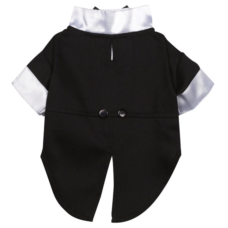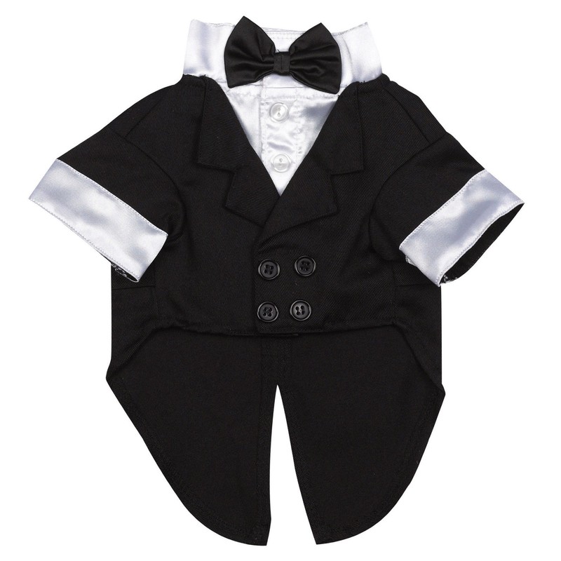 This East Side Collection \"Yappily Ever After\" Groom Tuxedo for dogs makes it easy to include pets in the wedding-day fun • White satin shirt is paired with a double-breasted tux coat with tails • A sharp-looking suit for the dog of the hour • Comfortable, easy-fit design with an adjustable hook and loop closure and a high-cut belly Material: 65% polyester, 35% cotton Sizes (Length): Teacup 6\"; XX-Small 8\"; X-Small 10\"; Small 12\"; Small/Medium 14\"; Medium 16\"; Large 20\"; X-Large 24\" Note: If the dog has a stout build, select one size larger Recommended Sizing by Breed: • Teacup: Dogs under 5 lbs • XX-Small: Toy Poodle, Pomeranian • X-Small: Chihuahua, Yorkshire Terrier • Small: Jack Russell Terrier, French Bulldog • Small/Medium: Pug, West Highland Terrier • Medium: Beagle, Boston Terrier • Large: Boxer, Labrador Retriever; X-Large: Golden Retriever, German Shepherd • XX-Large: Mastiff, Great Dane