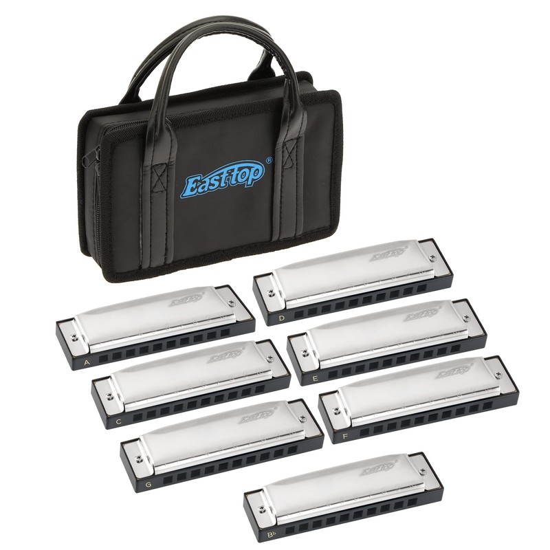 - Package includes 7x harmonica (key of A,Bb,C,D,E,F,G key); 7 keys black harmonicas into one canvas bag. We are the harmonica manufacturer of the East top brand. Backed Up with East top 30 Days Unconditional Money Back. You can rest assured to buy our products.