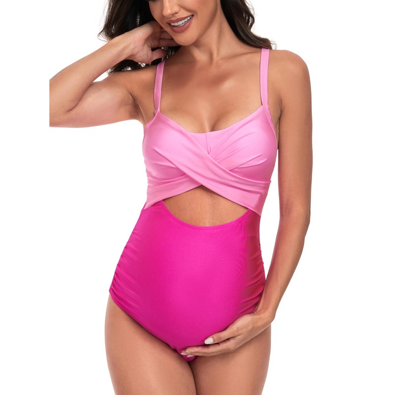EastElegant Maternity Cutout One Piece Swimwear Front Cross Pregnancy Bathing Suit with Wrap Tie Back, Pink, XX-Large