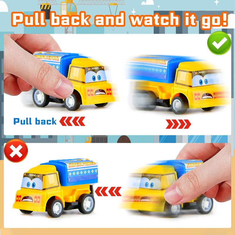 - Adorable Design. There are 12 assorted mini pull back construction vehicles in the set that the kids can enjoy playing with. Each pull back car is designed to accommodate harsh play time of toddlers boys, girls, kids.