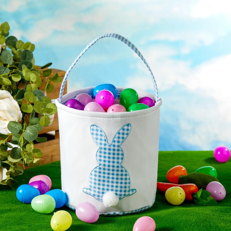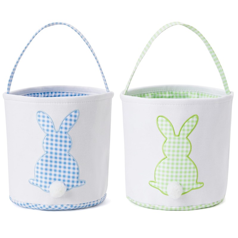 - MULTI OPTIONS FOR CHOICE - Three colors and three different patterns provide different choices for kids. Baskets are available in pink, blue, green. Bunny design is printed on the front. White canvas printed with cute bunny, bunny with plush pom tail, bunny face with colored ears. Your child will love this cute basket for years to come.