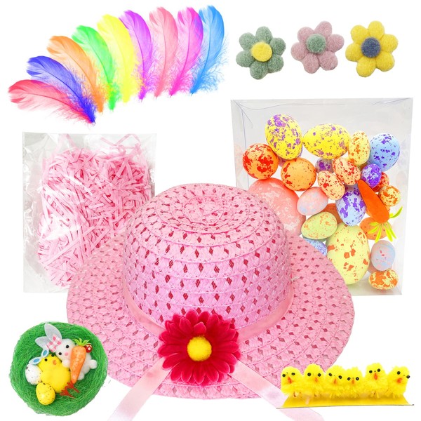 Easter Bonnet Kit - Easter Crafts for Kids, DIY Easter Hat Making Kit with Chicks, Feather, Carrots, Eggs, Nests, Flower, Easter Bonnet Decorations for Kids DIY Activity (Pink)