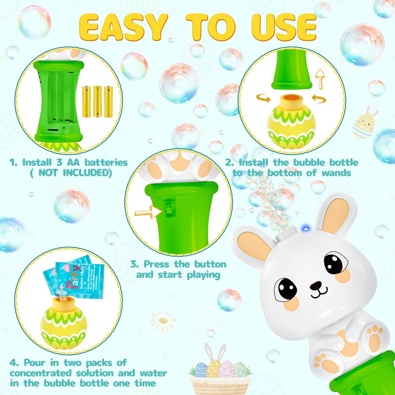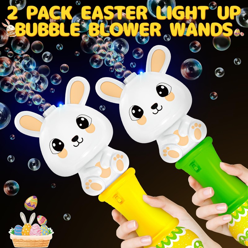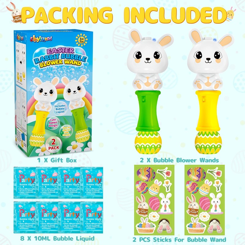 - Unique Easter Bunny Bubble Wand: The set includes 2 light-up bubble wands(yellow and green), 2 bottles of bubble solution, 4 packs of refills, and 2 Easter-themed stickers.
