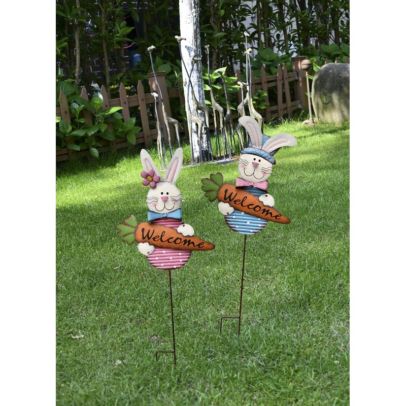 - EASTER BUNNY GARDEN DECOR: Metal Easter rabbit garden stake is great for Easter decoration. Cute Easter bunny holds a carrot welcome sign decor. Simple colored Easter rabbit yard stake will look great amongst flowers in garden during Easter and spring.