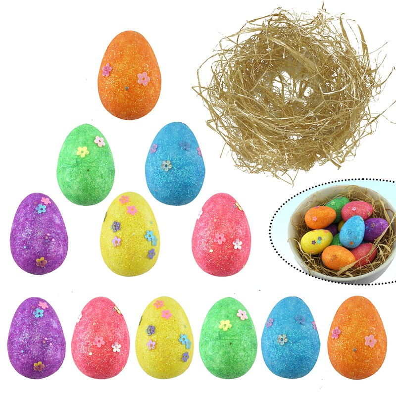 Each pack contains 12 polystyrene eggs approx 35mm in length, which are painted in a range 6 bright colours as illustrated. They are decorated with glitter detail and small sequin flower shapes. To accompany the eggs you will receive some imitation grass in a natural straw colour (raffia).