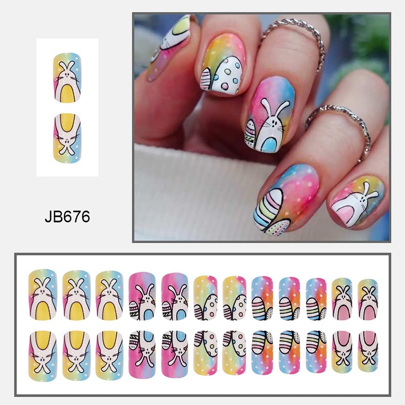 Easter Rabbit Press on Nails Colorful Fake Nails Square Cute Glue on Nails Full Cover Acrylic Nails Easter Eggs Bunny False Nails Medium Length Artificial Nails Reusable Stick on Nails for Women