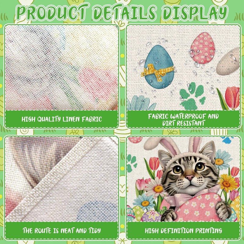 - High-quality materials - Easter table decoration: Our Easter table runners and placemats are made of soft, durable linen, which is easy to clean and easy to iron. Delicate texture of the fabric, non-slip quality. Easter tablecloth and placemats Easter its bright print does not fade even after repeated washing and can be reused for a long time. Strong stitching, soft and durable, protect your table surface from hot pans, scratches and spills.