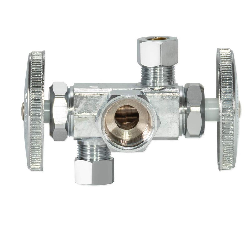 The Eastman Speed-flex 3-way shut-off valve is a multi-turn valve that resists corrosion and provides a water-tight seal. This stop valve has a 1/2-inch female iron pipe inlet x dual-outlet connection: 3/8-inch outer diameter compression outlet x 3/8 outer diameter compression outlet. It is a professional series valve with a solid brass body and solid brass nuts, chrome-plated finish. It is equipped with 2-handles for separate flow control of each outlet. This multi-turn stop valve controls water flow at the plumbing fixture, eliminating the need to turn off the water supply to the entire home for maintenance. Removable handles with an oval design for easy-grip. UPC and NSF approved, complies with Lead Free law.