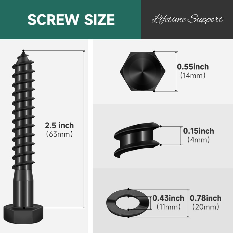 - EXQUISITE CRAFTSMANSHIP - Lag screws feature a diameter of 3/8", a length of 2-1/2 inches, and a wrench size of 9/16". The excellent craftsmanship ensures the hex head lag bolts are strong, fast to install, resistant to breakage, highly durable, and maintains its shape without deforming or wobbling. Lag screws for wood, screws and bolts screws and nuts.