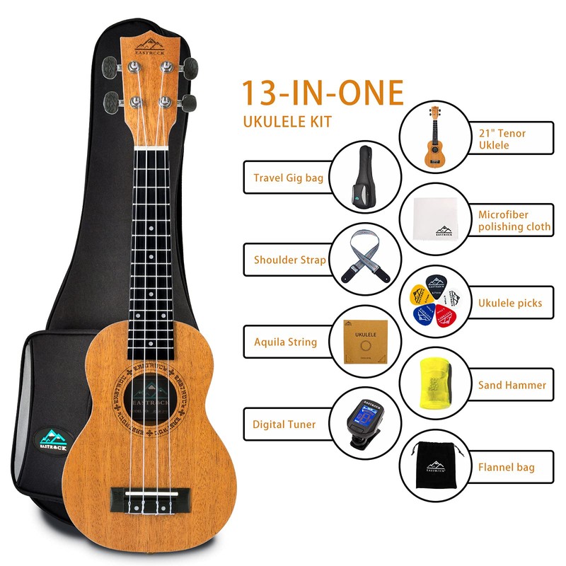 - đžăALL-IN-ONE SETă- Pre-tuned before shipping to help ensure the strings stretch out properly and stay in tune better upon arrival. EASTROCK Ukelele set includes a 21" soprano Uklele,1*Ukalele Padded backpack gig bag which Fits all standard size Ukuleles. Outside pocket can hold tiny stuff like string set, picks, paper ext. 5*Ukele picks,1 set* String,1*Tuner,1*Microfiber polishing cloth,1 Flannel bag,1*Sand Hammer. (Soprano Ukalalee,Ukelele)