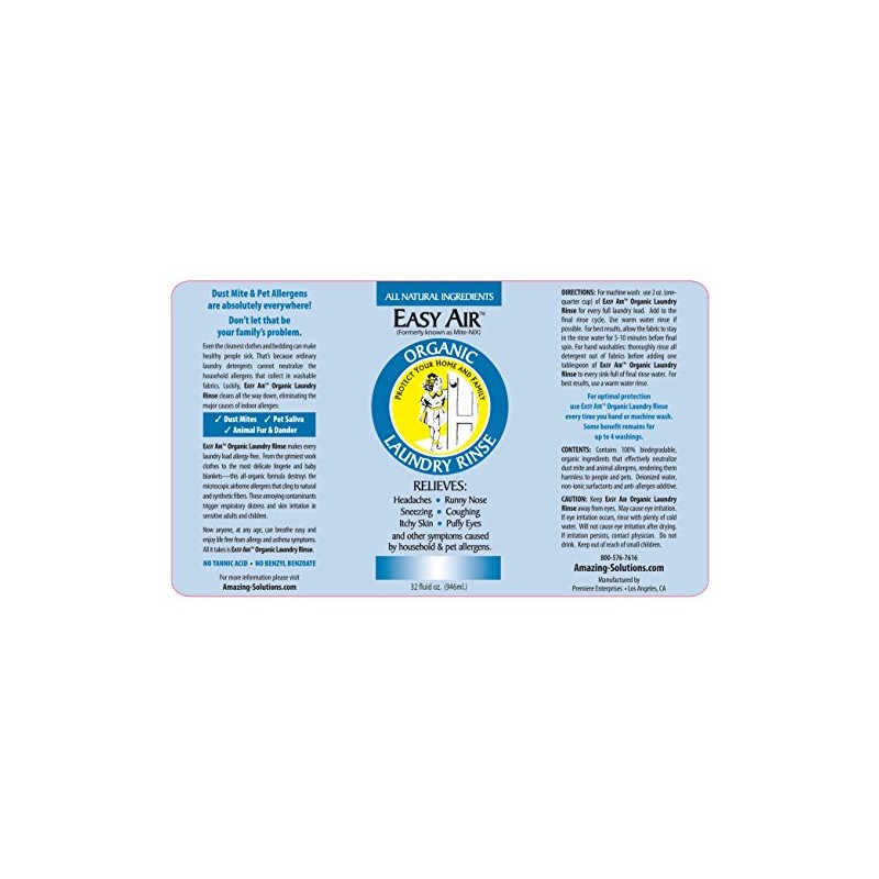 EASY AIR ANTI-ALLERGEN Easy Air Organic Allergy Relief Laundry Rinse, Hypoallergenic & Fragrance Free, Eliminate Odors. Asthma & Allergy Safe for Babies & Pets - 32 Fl Oz