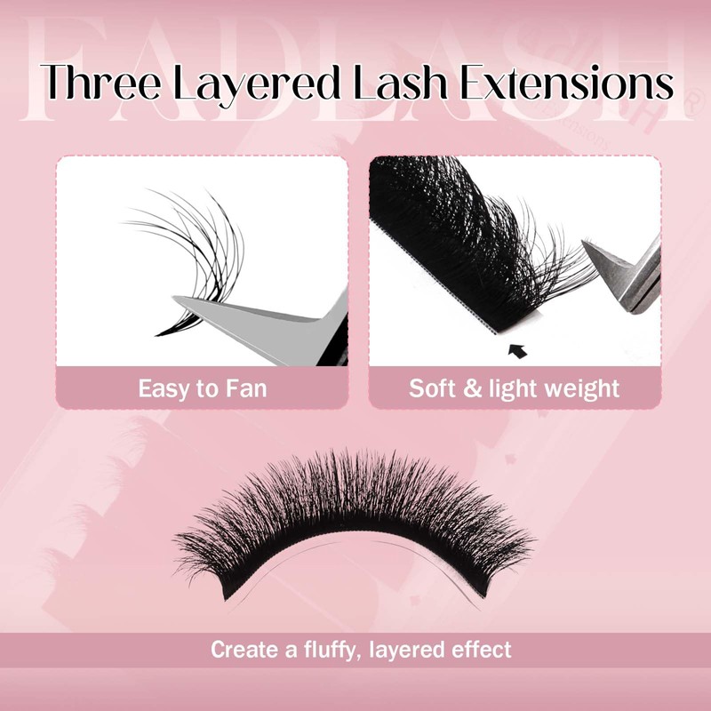 - 3D Layered Lashes: Unlike traditional easy fan lashes, Fadlash's 3D eyelash extensions are composed of different curves and lengths. The 3D eyelash extensions are natural, easy fan lashes in varying lengths. Easy fan lashes are soft, comfortable, and natural-looking. They can achieve an instant layered effect, offering a beautifully layered look that helps you create a feathery flutter lash.
