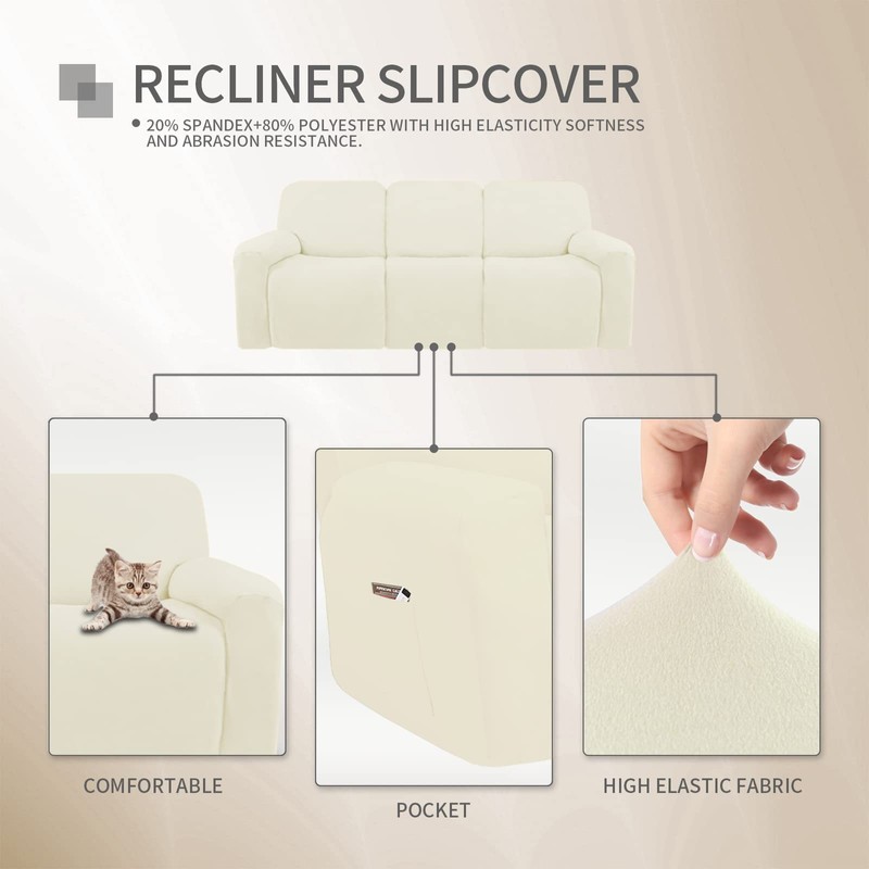 Easy-Going 8 Pieces Microfiber Stretch Sectional Recliner Sofa Slipcover Soft Fitted Fleece 3 Seats Couch Cover Washable Furniture Protector with Elasticity for Kids Pet (Recliner Sofa, Ivory)