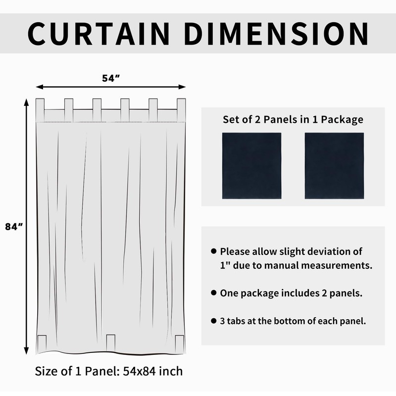 - Tab Top & Bottom: Constructed with detachable tab top, which makes the curtains to be moved around and hung with ease. The bottom tabs make the curtain fixed enough that it won't be blown by the wind. It provides protection against rain, snow, heavy wind and other harsh weather element.