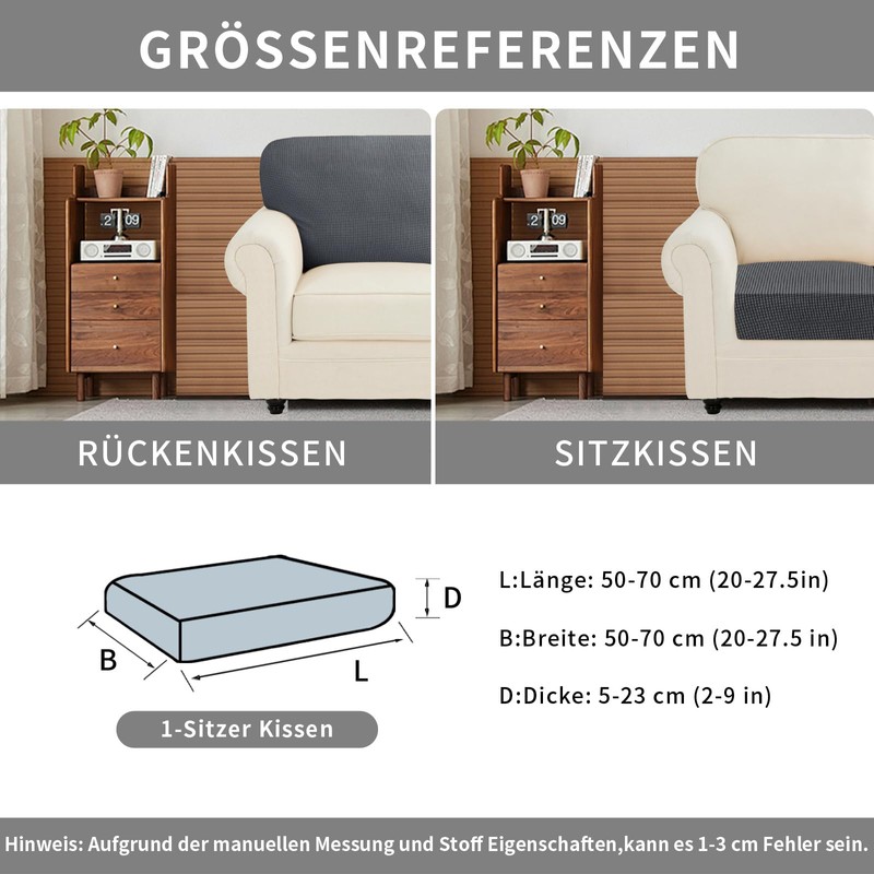 - PERFECT FIT FOR MULTIPLE SIZES Our detailed size options ensure the perfect fit for your sofa seat cushions. We offer 5 sizes of seat cushion covers for different shapes of cushions, the appropriate cushion size for the chair cover you choose: width 50-70 cm, depth 50-70 cm and thickness 5-23 cm. Package includes: 1 x 1 seater armchair seat cushion cover. Please measure your sofa seat cushions carefully before purchasing to ensure the perfect fit.