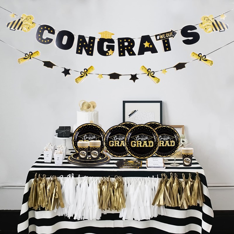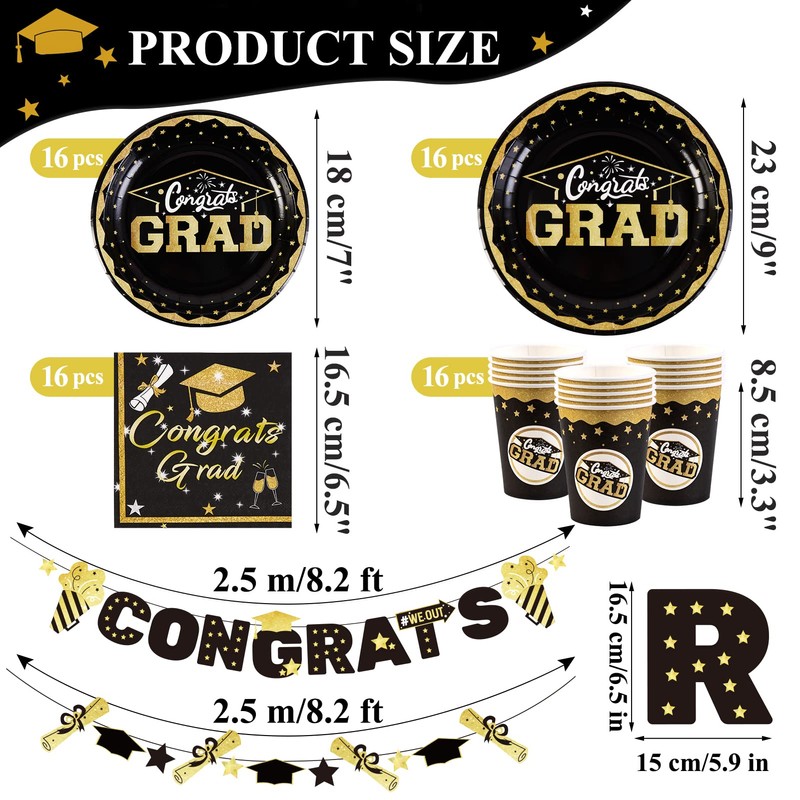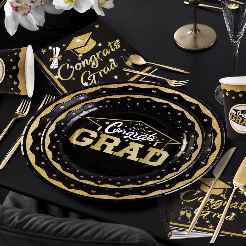 - 🖊️Complete your 2024 graduation party decorations with this classic black gold graduation tableware set featuring elegant foil-edged plates and durable, eco-friendly materials.