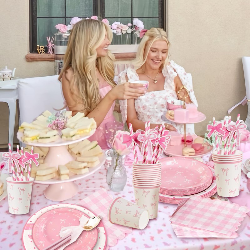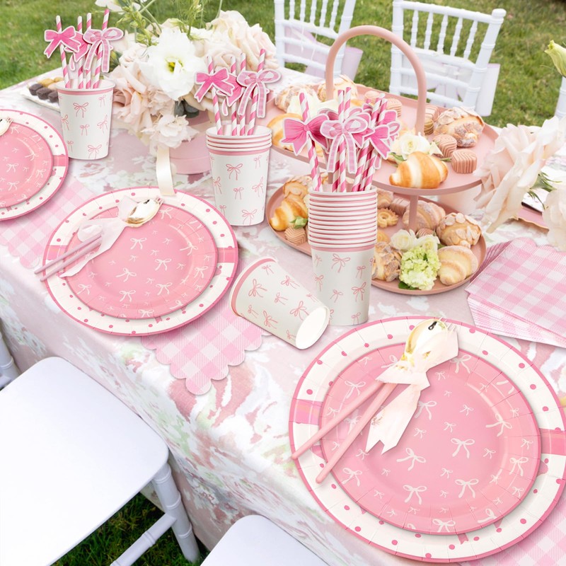 - 🎗️Serve 16 Guest Party Tableware Set: Pink Bow themed party decoration set includes 32 plates, 16 cups, 16 straws, and 16 napkins, all featuring delicate pink bows for a charming and elegant touch to your celebration