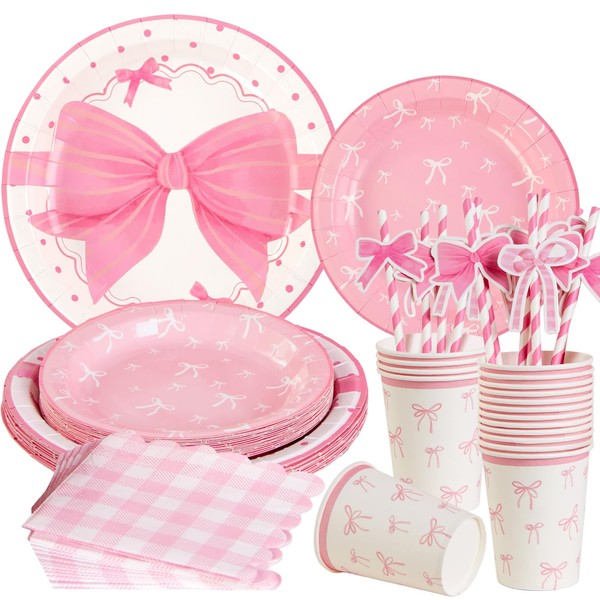 - 🎗️Cute Pink Bow Birthday Party Supplies: These pink bow tableware are all printed with a striking pink bow and the three-dimensional and vivid color patterns are so clear that will create a elegant and beautiful atmosphere for girl themed parties, adding a charming sweet feeling to your party