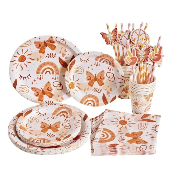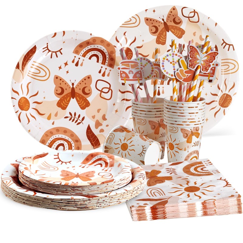 - Butterfly Paper Plates: This Boho party plate is adorned with cute and fun patterns such as rainbows, clouds, butterflies, and the sun, making your party decor vibrant and creative.